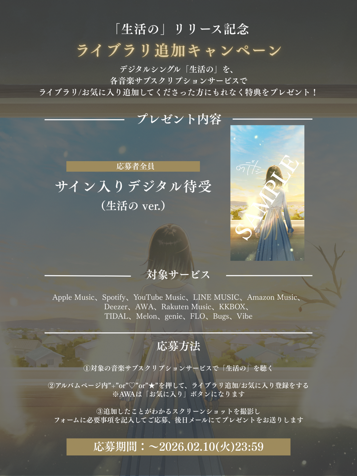 「生活の」を、各音楽サブスクリプションサービスでライブラリ/お気に入り追加してくださった方にもれなく【サイン入りデジタル待受(生活のver.)】をプレゼント!